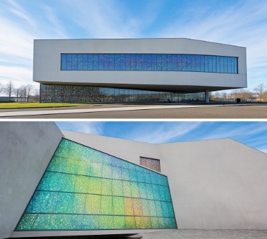 冰島哈帕音樂廳采用彩色玻璃微珠嵌入金屬幕墻,通過多層疊合工藝形成漸變光影效果,日均反射光輻射量較普通玻璃降低40%。